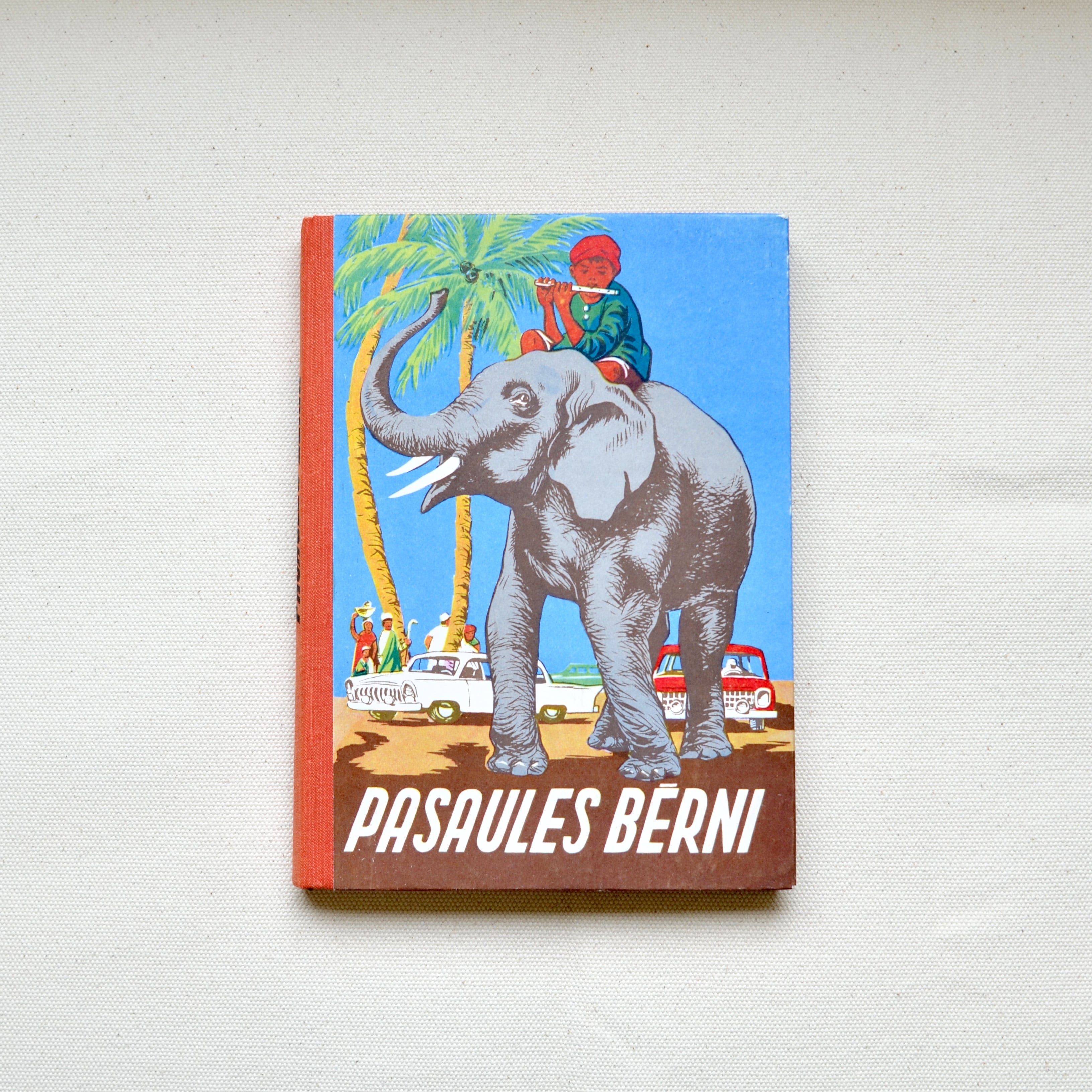表紙には、象に乗った少年が横笛を吹いている。その背景には、白と赤の車、計2台と椰子の木2本、少年と同じ民族か、5人が小さく描かれている。